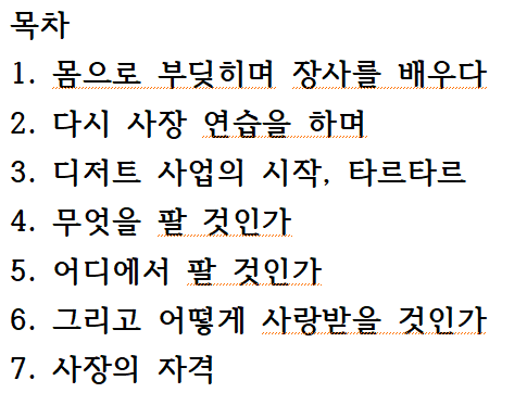 저자의 직접적인 경험들이 적혀있다 보니 책을 읽으면서 수긍이 많이 되었습니다. 이론적인 글이 아니라 실제적인 글들은 항상 공감을 일으키기 좋은 것 같습니다. 체인점으로 시작한 것이 아니라 개인이 브랜드를 만들어가는 과정을 적은 책들을 그렇게 많지 않은 것 같습니다. 타르타르를 만드는 과정부터 성공하기까지의 과정과 그 속에서 다른 사람들의 부정적인 말들을 거르고 성공으로 이끄는 노하우들이 참 보기 좋았던 것 같습니다. 그저 운으로 성공한 것이 아니라 실력으로 성공한 저자의 말이 많은 공감을 불러온 것 같습니다. 운이라고 하면, 한 가게만 성공해야 하는데, 타르타르뿐만 아니라 라라브레드까지도 성공을 시키신 것을 보면 20년의 노하우가 그냥 이루어진 것이 아니라는 생각을 하게 됩니다.