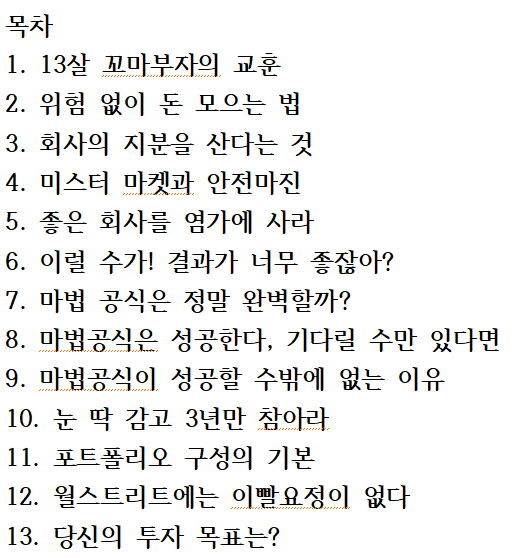 이 책의 감수를 한 분이 저자에 대해 버핏이나 템플턴 경 못지않게 곧 거장의 자리에 오를 것이다라고 말하고 있습니다. 저자가 운용하던 고담 캐피털이 1985년부터 2005년까지 평균 40%라는 말도 안 되는 수익률을 올렸기 때문입니다. 이 결과는 모든 투자자들이 우러러보는 버핏보다 나은 결과입니다. 무엇인가 굉장한 방법이 있을 것으로 여기지지만, 실제로는 단순한 기법을 저자는 사용하고 있습니다. 두 가지 지표만을 사용하는데, 이 지표의 설명을 위해 초등학교 6학년 때 반 친구였던 아이의 예를 들면서 이야기를 시작합니다. 흥미롭게 이야기가 진행이 되면서 설명하는 것이, 좋은 회사의 주식을 염가에 사는 것이 핵심이다라고 말합니다. 이것은 워런 버핏도 언급한 적이 있는 방법입니다. 한국 주직시장에서도 2001년부터 2006년까지의 데이터를 사용하여 진행해 보았더니, 2,000%가 넘는 수익률을 보였다고 말합니다. 굉장히 좋은 방법이지만, 여전히 단점은 존재합니다. 장기적으로 볼 때는, 획기적이지만, 단기적으로 볼 때는 좋은 수익률을 주지 않을 수도 있다고 말합니다.