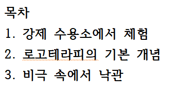 사람은 자신의 행동에 선택권을 가질 수 있다고 이야기합니다. 수용소에 오래 있다 보면, 무감각 증세가 일어난다고 합니다. 옆의 사람들이 죽어나가는 것들, 고통에 대해, 삶에 대해 무감각 증세가 일어난다고 말합니다. 많은 경우 이런 무감각 증세를 계속적으로 느끼지만, 어떤 사람들은 이것을 극복하고 있다고 밝힙니다. 수용소 안에서는 정신적으로 육체적으로 많은 스트레스를 받지만, 그 안에서도 정신적, 영적인 자유를 소유할 수 있다고 말합니다. 사람의 모든 것을 가지고 갈 수 있어도, 단 한 가지만은 절대 빼앗을 수 없다고 합니다. 그것은 바로 사람이 자신의 태도를 결정하는 것, 그리고 자신의 길을 선택하는 자유는 절대로 빼앗아 갈 수 없다고 말합니다. 수용소나 어려움의 터널에서 정신력을 회복하는 길은 미래에 대한 희망을 확실히 심어주는 길이 있습니다. 살아야 할 이유, 그러니 왜 살아야 하는 것에 대한 해답이 있는 사람은, 어떤 상항과 환경 속에서 견딜 수 있다고 말합니다. 희망을 잃어버린 사람들에게 알려주어야 하는 것은, 왜 살아야 하는지, 즉 목표를 심어주어야 합니다. 인생에 더 기대할 것이 없는 사람들은, 삶을 놓아 버리게 됩니다. 주어진 상황에서 최선을 다하는 삶은 비극 속에서 낙관적인 삶을 살게 됩니다.