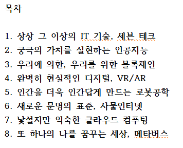 김미경 님은 이미 너무나 잘 알려진 강사입니다. 소개할 필요가 없을 정도로 많은 곳에서 강연을 하셨고, 많은 사람들의 마음에 불을 붙이신 분입니다. 예전부터 내신 책들을 보면, 미래에 이런 산업들이 발달할 것이다 그러니 준비하라는 식의 책들을 적으셨는데, 선견지명 있다고 생각될 정도로 그 부분이 발달했던 적이 있습니다. 유튜브가 성장하기 시작하는 시점인지, 그 전인지 이런 플랫폼이 발전할 것이니 준비하라고 하셨었습니다. 그런 부분과 일맥상통하게, 이번에도 비슷한 내용으로 책을 적으셨습니다. 그래서 그런지 신뢰가 갔습니다. 물론 책에서 나온 모든 분야가 다 성공적으로 발전하지 못할 수도 있습니다. 하지만 이중 몇은 분명히 발전할 것이고, 전문가님들의 견해대로 흘러갈 것이라고 생각이 듭니다. 7가지 분야에 대해서 적혀 있습니다. 위에 목차에 나와 있지만, 다시 한번 정리해 보면 다음과 같습니다. 메타버스, 사물인터넷, 클라우드 컴퓨팅, 블록체인, 로봇공학, 가상현실 증강현실, 인공지능 이 일곱 분야를 다루고 있습니다. 저도 모르는 분야가 많았는데, 읽는데 전혀 어려움이 없을 정도로 쉽게 적혀 있었습니다.