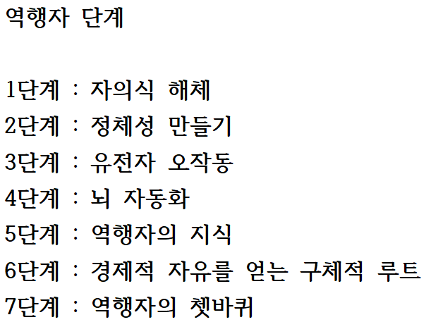 책은 사람을 역행자와 순리자 두 가지로 분리하고 있습니다. 역행자는 정해진 운명을 거스르는 삶을 사는 사람, 순리자는 타고난 운명을 그대로 사는 사람을 의미합니다. 현재 95%의 사람들이 순리자의 삶을 살고 있습니다. 그래서 성공하는 삶을 살고자 한다면 역행자로 변해야 한다고 말하고 있습니다. 그러기 위해서는 위에서 말하는 7단계를 거쳐야 합니다. 이 중에서 중요한 부분은 정체성을 재정립하는 것입니다. 정체성을 만드는 것은 결심으로만 이루어지지 않습니다. 결심과 더불어 환경을 조성하는 것이 중요합니다. 환경을 조성하지 않으면 사람들은 대부분 결심의 단계에서 멈추게 됩니다. 환경을 조성하여 자신을 그렇게 할 수 있게하는 것이 중요합니다. 많은 사람이 경제적, 정신적 자유를 얻지 못하는 이유가 무의식, 자의식, 유전자의 영향 때문이라고 말합니다. 무의식은 자신의 한계를 정하게 하고, 자의식은 끊임없는 합리화를 통해 발전을 막으며, 선사시대로부터 내려져 오는 유전자 때문에 새로운 도전과 시도를 못 하게 한다고 말합니다. 이 중 무의식을 바꾸는 것이 중요하며, 나머지 두 가지 요소들도 역행하면서 바꾸어야 한다고 말합니다. 위의 7가지 단계들을 거치면서 우리는 새롭게 된다고 말하고 있습니다. 우리가 새롭게 되려면 이 7가지 단계를 계속해서 되풀이해야 한다고 말하고 있습니다.